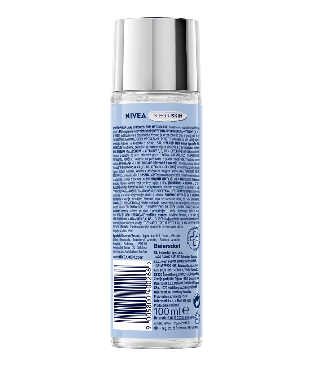 Megköti a bőrben található nedvességet, hidratálja felfrissíti és revitalizálja a bőrt. Láthatatlan, azonnal felszívódó formulája Mega Moisture hatóanyag-komplexszel működik. Az 5% [hialuronsav + E-, C-, B5-vitamin + glicerin] mélyen és hosszantartóan hidratál, kellemes, komfortos bőrérzetet hagy maga után. Gyorsan beszívódik, nem ragad, és segít megőrizni a bőr frissességét egész nap: NIVEA MEN HYDROCARE Hidratáló Esszencia